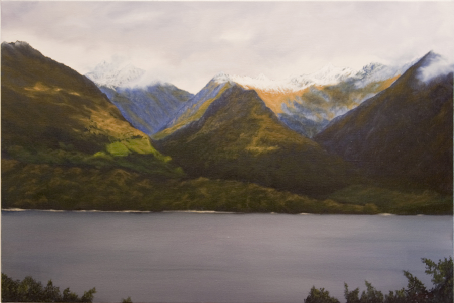 90 cm wide x 60 cm high. Dappled light moving across the far side of the lake just forced me paint this. Sold